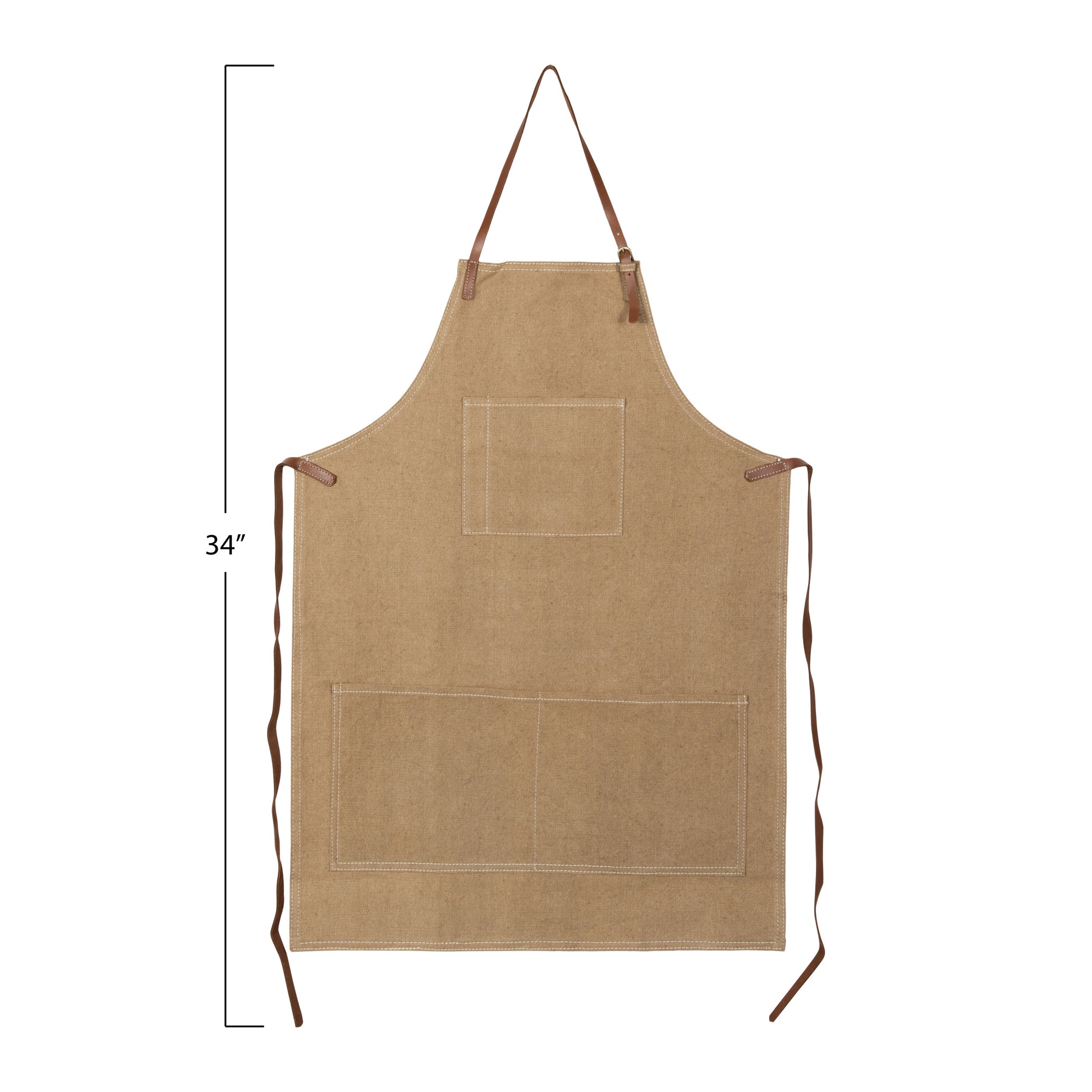 Heavy khaki canvas is accented with beautiful brown leather straps and multiple pockets to create an apron to enjoy wearing even when company is around. With plenty of room for recipe cards, phone and a small towel, never be too far away from items that are needed most. With the thick canvas material, it will also be a convenient apron to where while doing crafts or projects around the home.