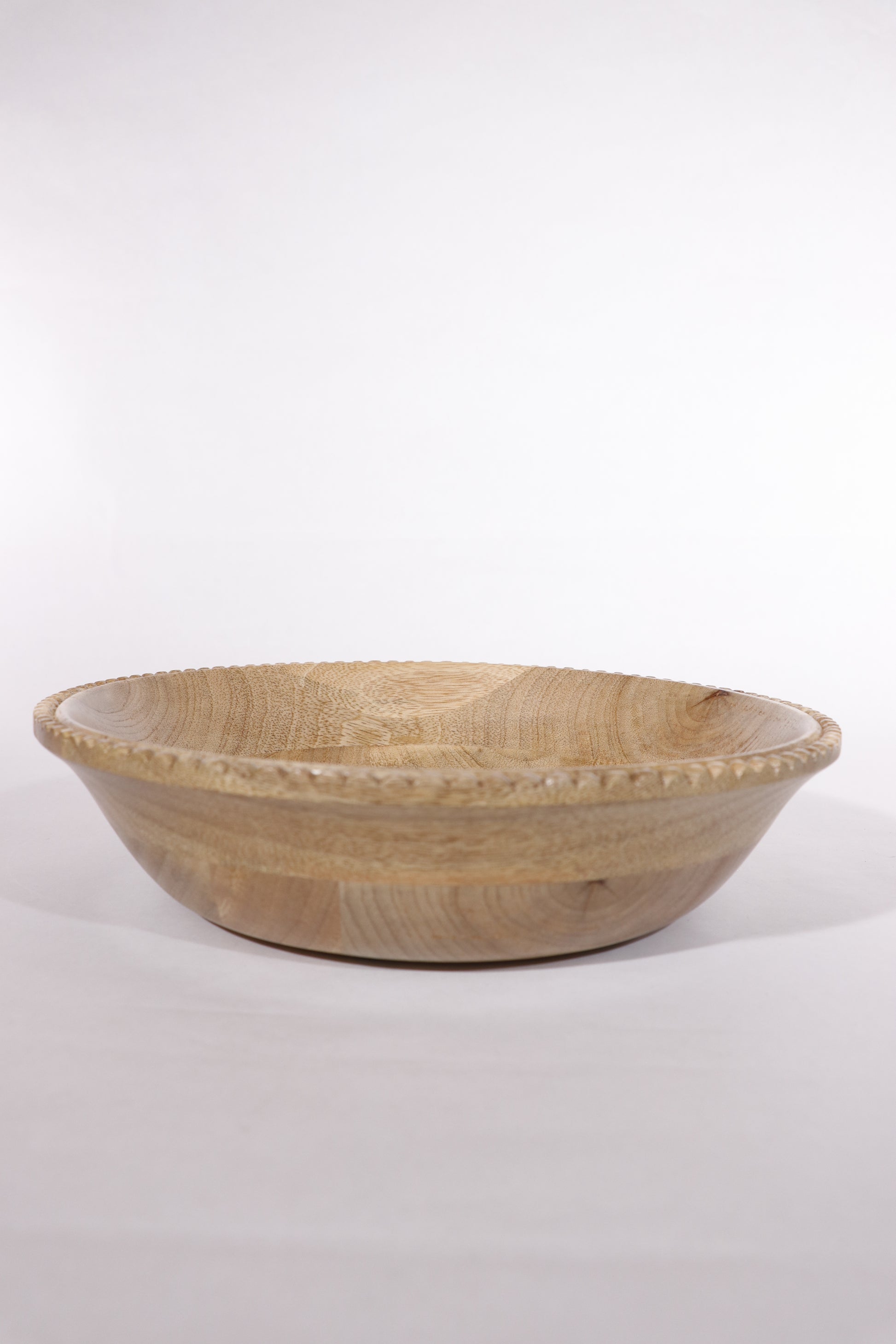 Made from mango wood, a sustainable and incredibly durable hardwood, this hand-carved bowl highlights the wood's rich grain with a natural finish. Versatile and visually appealing, this bowl is perfect for serving salads, fruits, or snacks. Local master artisans in Jaipur, India, meticulously handcraft every piece in dedicated workshops, employing time-honored traditional techniques.