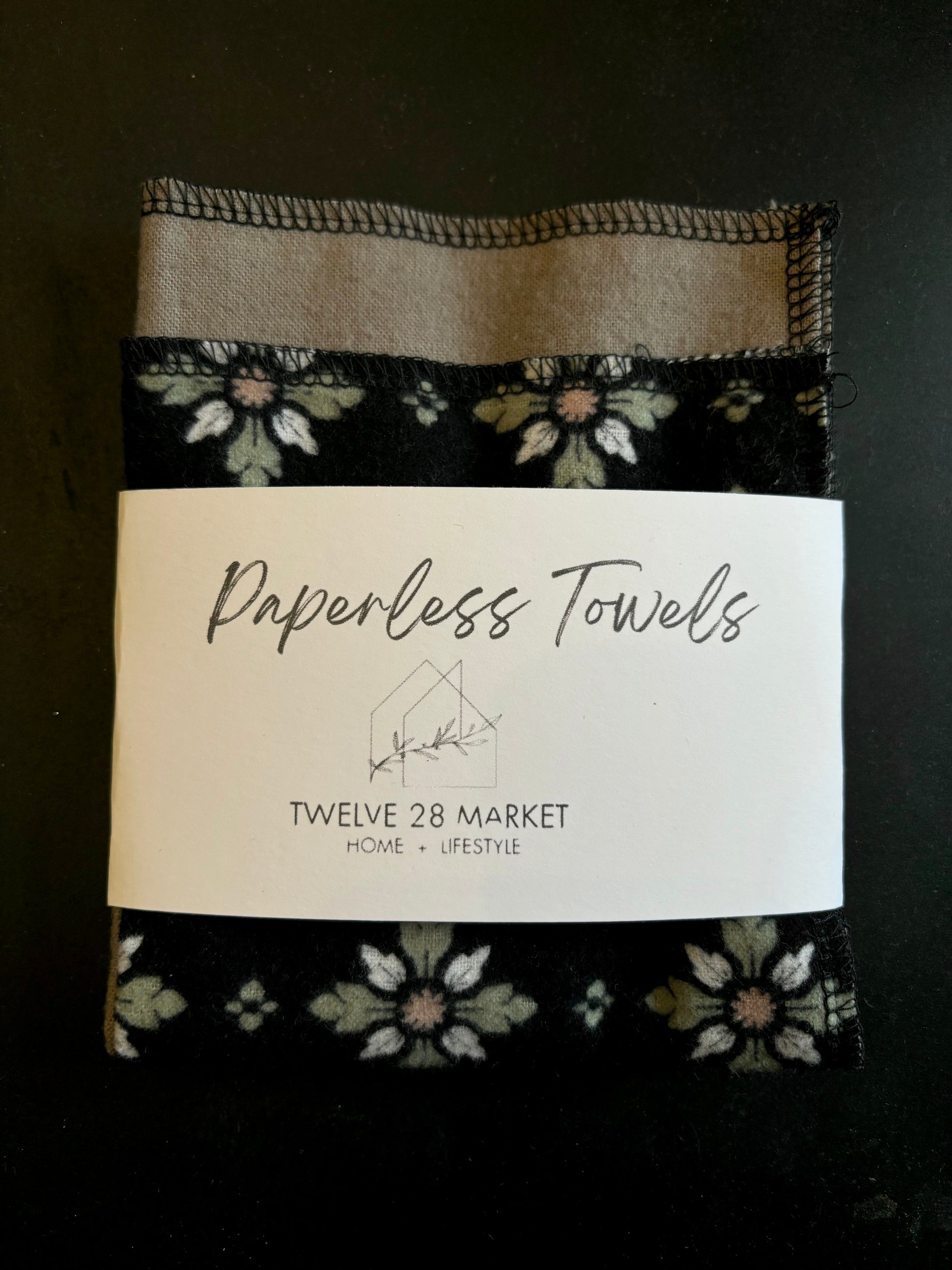 Paperless Paper Towels, White Floral on Black & Black, Set Of 2