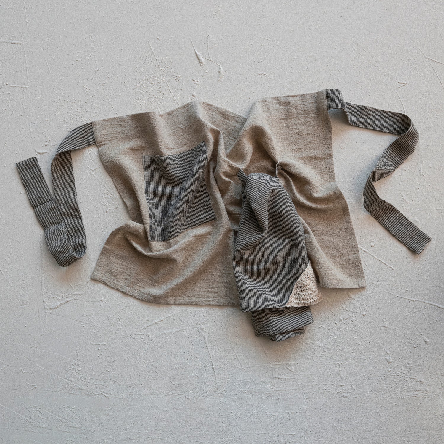 Linen Blend Half Apron w/ Pocket & Tea Towel Holder Loop & Tea Towel w/ Crochet Lace, Natural & Black, Set of 2 w/ Jute & Wood Bead Tie